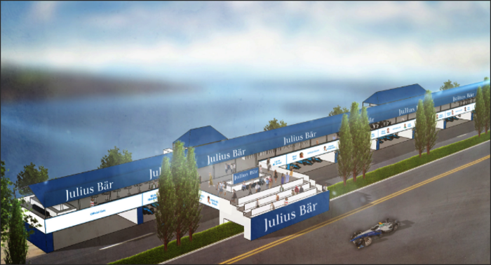 Set up of the Julius Bär Pitlane Lounge and Formula E Garages below for the Formula E-Race in Switzerland.